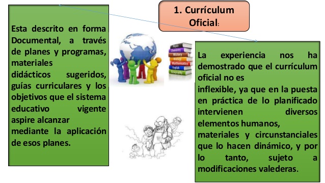 1. Currículo Oficial o escrito: : Es el documento que a través de planes y programas, materiales didácticos y guías registra los objetivos que la institución desee alcanzar para la educación, Su propósito es proporcionar a los docentes una base para la planificación de las clases y la evaluación del estudiante(este tipo de currículo no es flexible)
